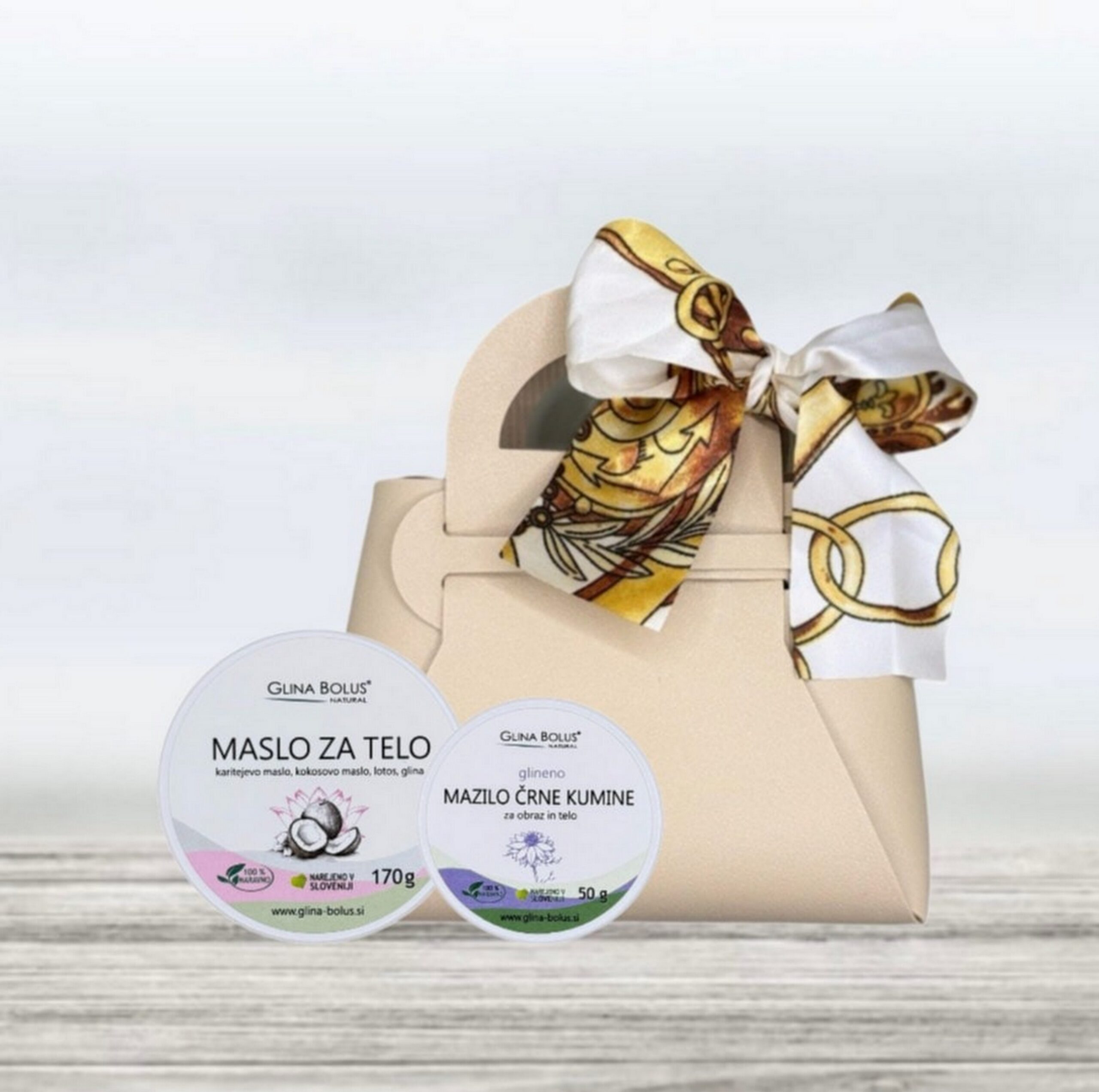 Vključuje glineni deodorant z bergamotko in glineno zobno pasto – oboje 100 % naravno, brez aluminija, brez fluoridov in brez umetnih dodatkov.