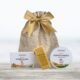 Elegantni darilni žakeljček iz naravne jute je popolna izbira za okolju prijazno in estetsko embalažo. Vrhunski videz dopolnjuje satenasta pentlja v sveži limetno-zeleni barvi, ki poudari “fresh” karakter seta.